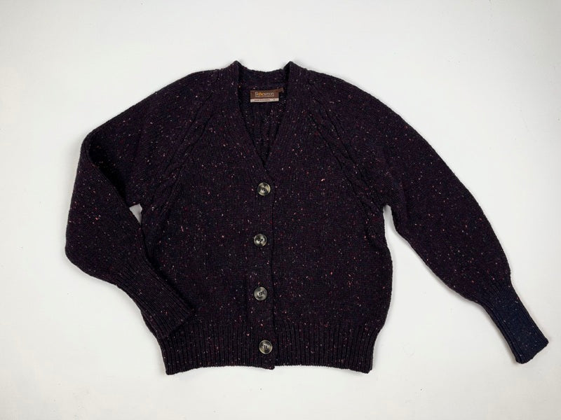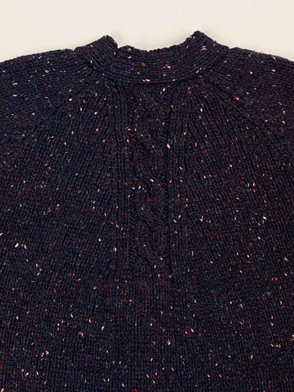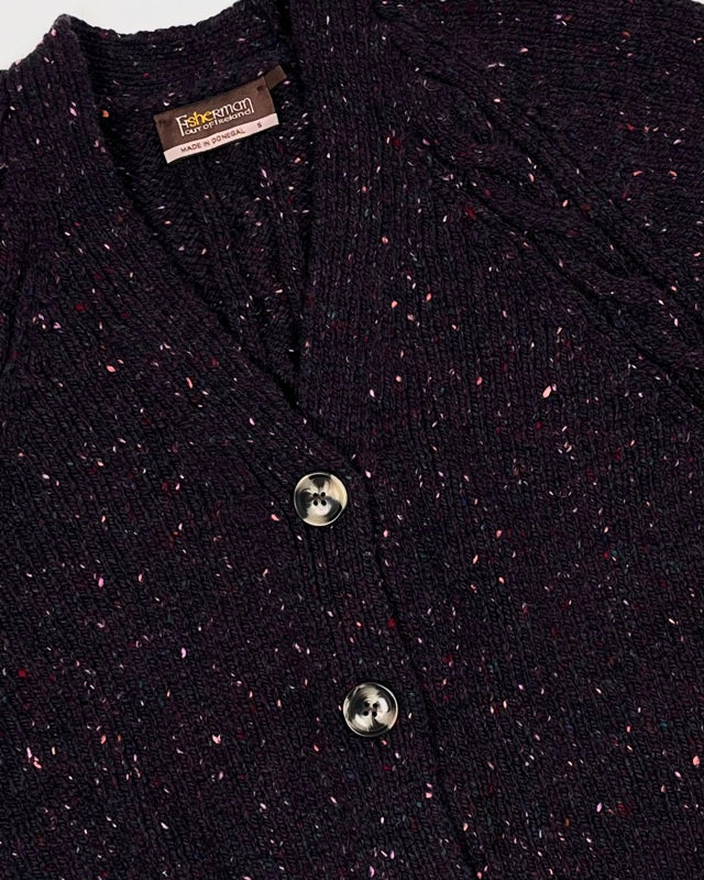 This raglan cardigan is a made in Donegal by Fisherman Out of Ireland. It has a beautiful cabled detailing in the back and on the raglan seam. Its short design is marked by a wide ribbed hem. Made from soft Donegal merino wool, we love its vibrant colour and the colourful flecks. A beautiful timeless cardigan that will keep you warm for many years to come.