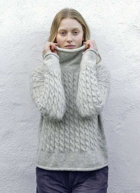 This cabled funnel neck sweater is a made in Donegal by Fisherman Out of Ireland. This beautiful and timeless sweater has a beautiful cable design with a soft long funnel neck and a relaxed silhouette. Made from a luxurious blend of baby alpaca and Highland wool, the jumper is really soft, warm and light. It will keep you stylish and snug for many years to come.